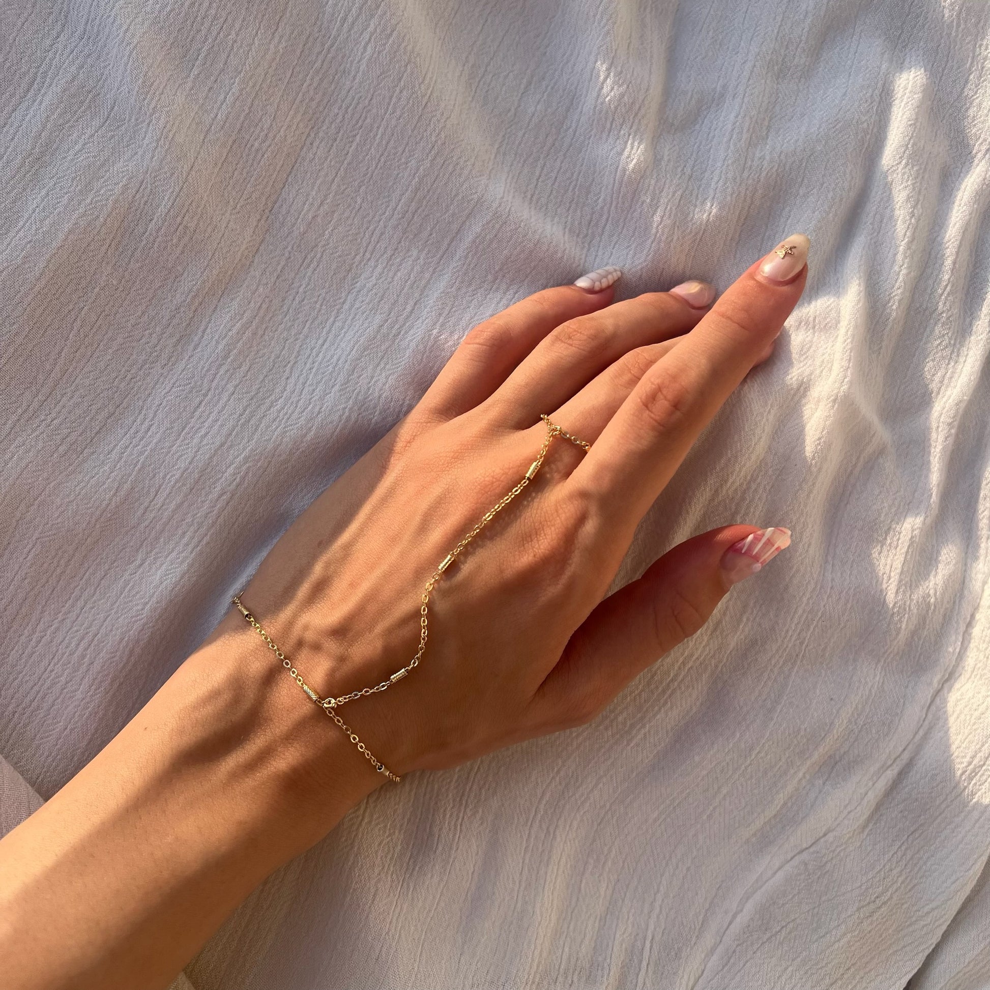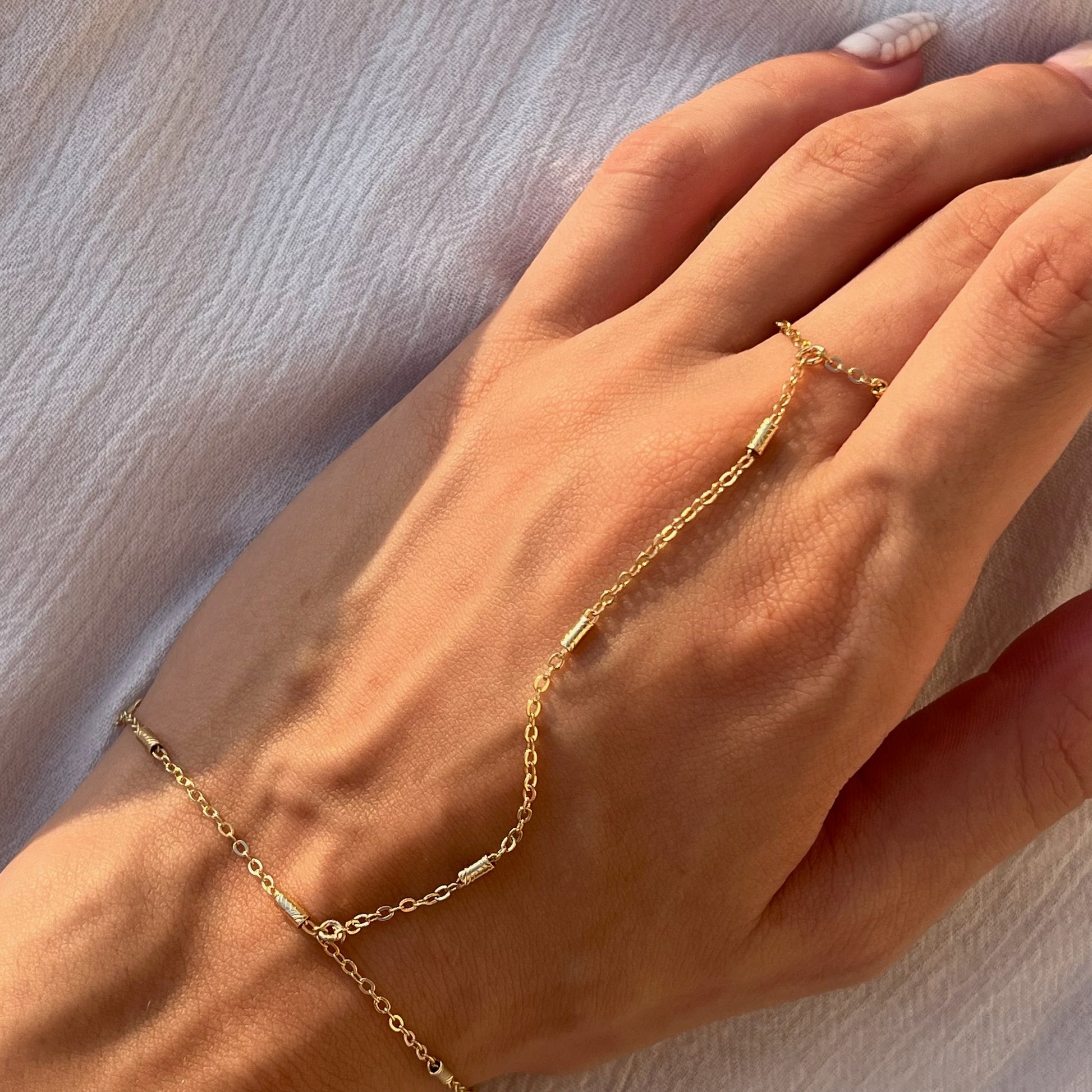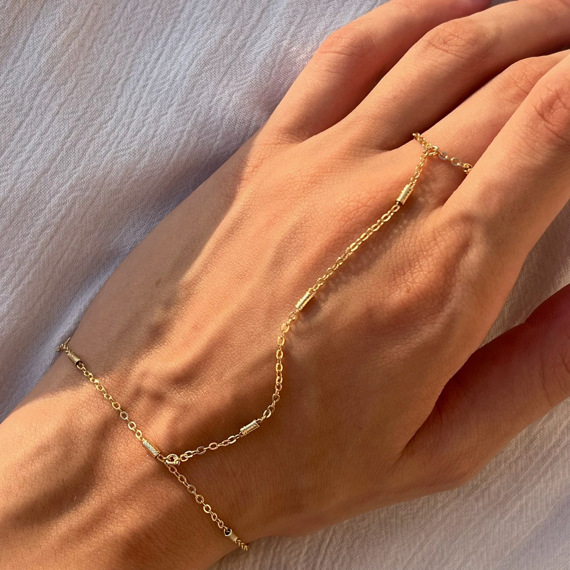 Slip on some serious style with Vertical Gleam! This stunning hand chain adds a touch of elegance and personality to any outfit. The unique design features a vertical gleam that will make you stand out from the crowd. Show off your quirky side and shine bright with Vertical Gleam.